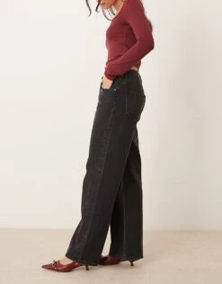 Gina Tricot Low Waist Wide Leg Jeans In Washed Black With Crystal Embellishment For Women