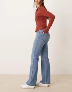Gina Tricot Low Rise Flare Leg Jeans With Front Panel Detail In Mid Wash Blue For Women