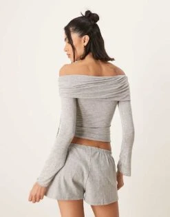 Gina Tricot Mix And Match Pointelle Embroidered Edge Cotton Pyjamas With Blue Bows In Grey Melange